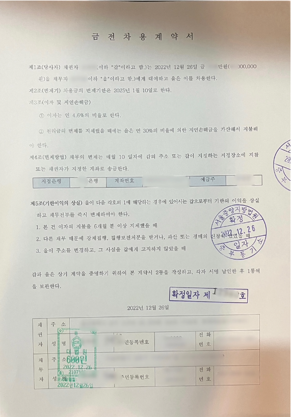 차용증의 법적효력 강화를 위해 꼭 확정일자를 받으시기 바랍니다.