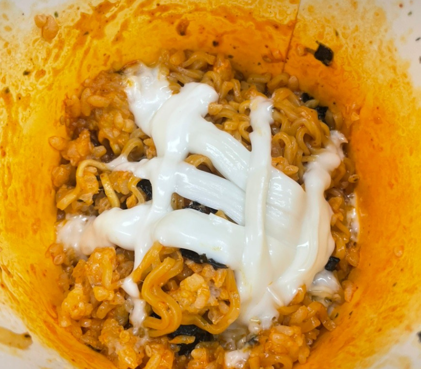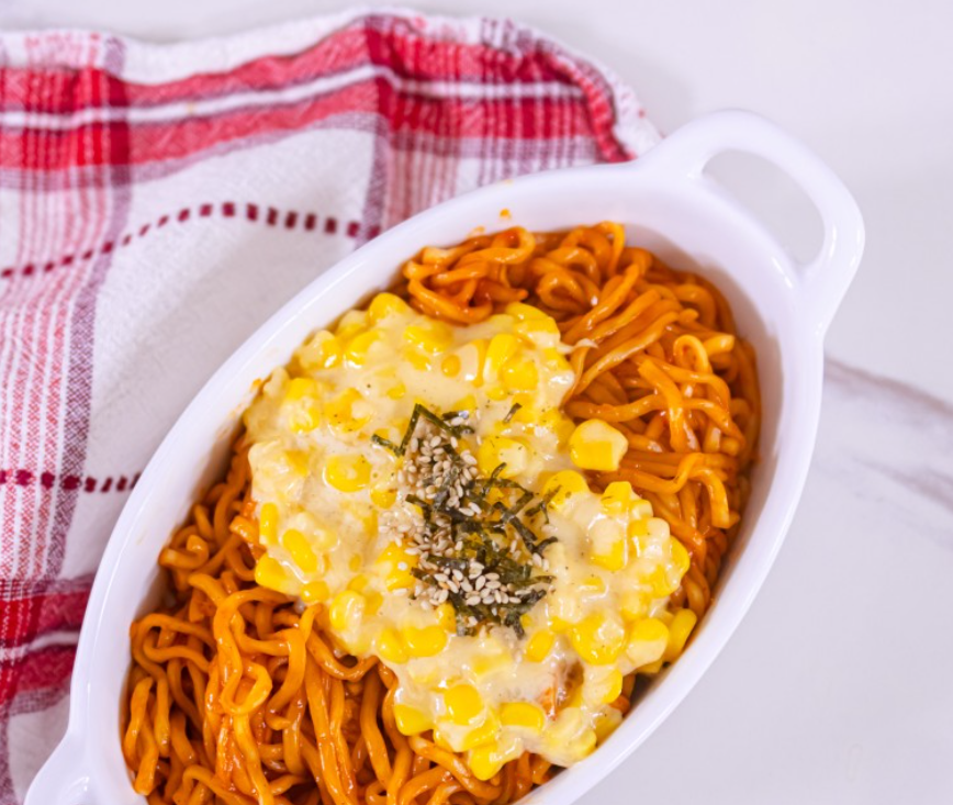 10. 불닭볶음면 + 옥수수 + 설탕 + 마요네즈 + 모짜렐라치즈 = 콘치즈 불닭볶음면