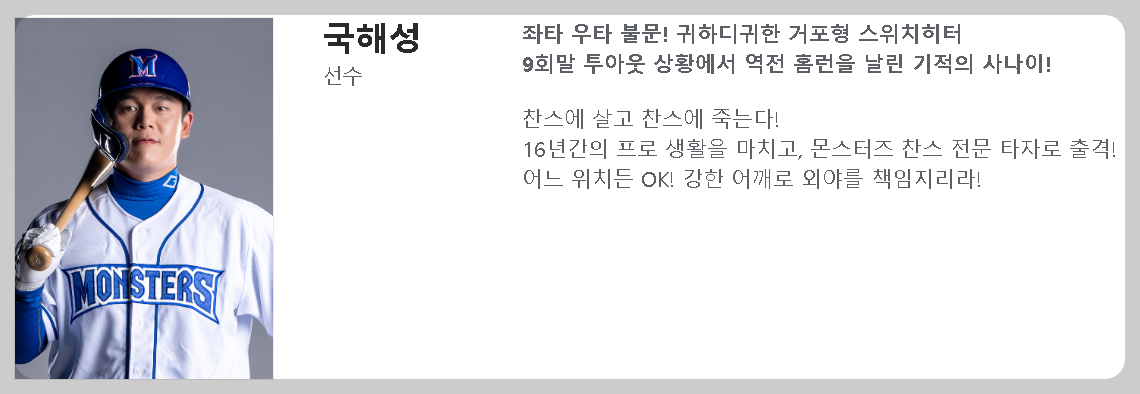 최강야구 공식 홈페이지에 있는 국해성의 소개 자료는 아래와 같습니다.