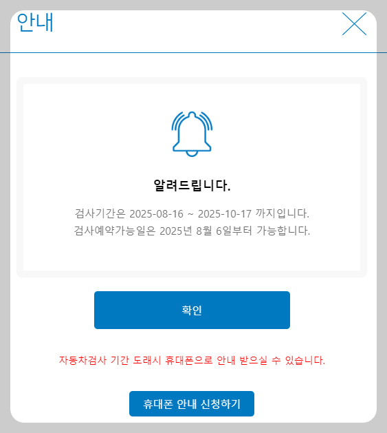 차량조회를 클릭하면 검사기간 언제 하라는 내용이 나옵니다.