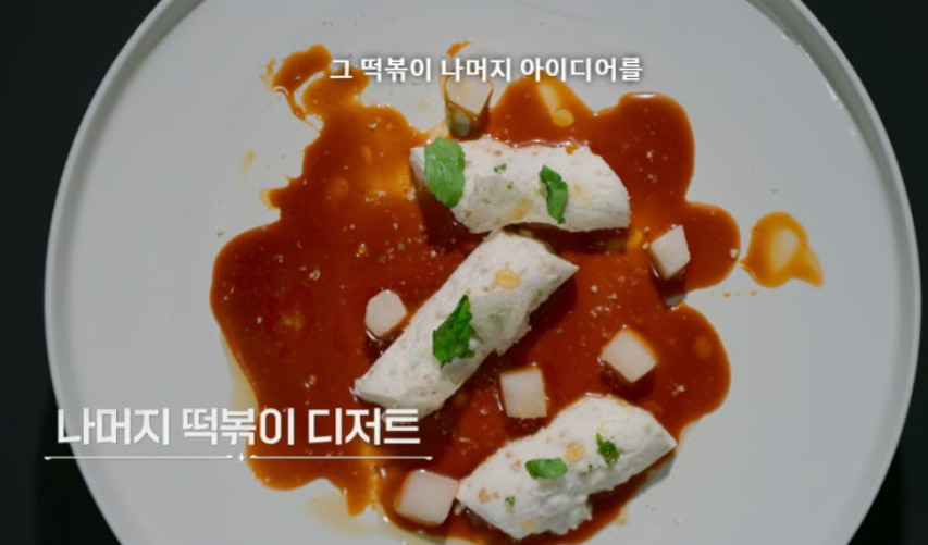 이균은 한국에서 밥을 먹을때는 항상 많이 주어서 음식을 조금 남겼다고 하면서 그것이 한국 음식의 특징이라고 밝히며 그 특성을 착안해서 떡 3개를 고추장 소스와 합친 요리를 내었던 것입니다.
