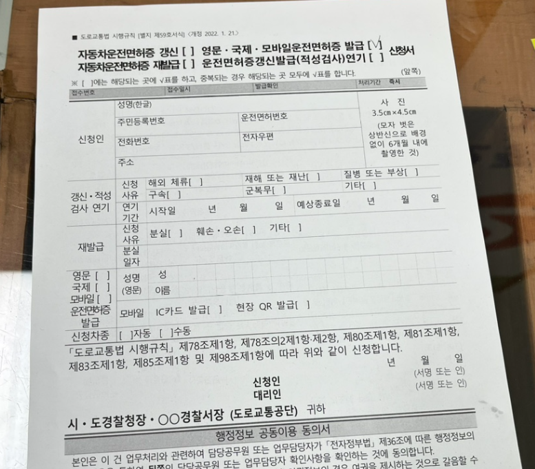 - 국제운전면허증 발급 신청서 (경찰서에 있음)