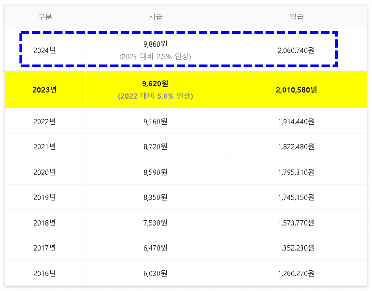 2024년 최저 임금 9,860원, 전년 대비 2.5% 인상