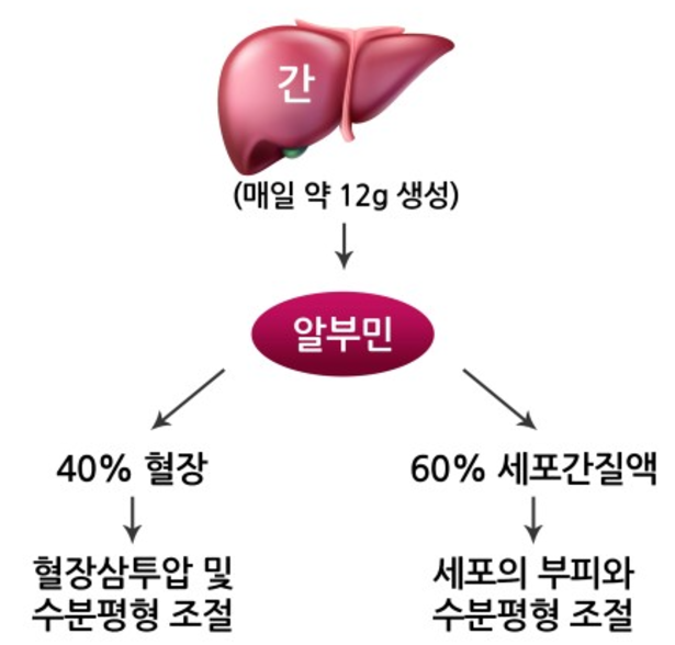 알부민은 혈관 내 삼투압 조절, 혈관과 조직 사이의 수분이동을 조절하여, 혈관내의 체액이 적절한 양을 조절하는 역할을 하여, 부종 예방과 체액의 불균형으로 생기는 복수나 기타 부작용을 예방합니다.