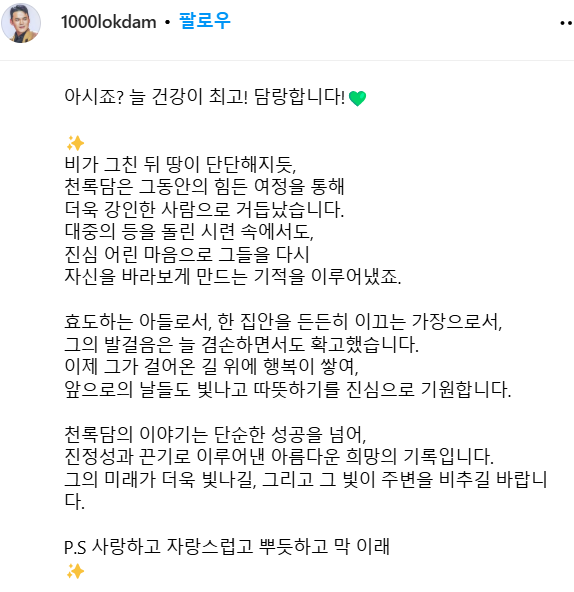 * 아래에는 미스터 트롯3를 완전히 끝내고 천록담이 팬들에게 올린 글 입니다.