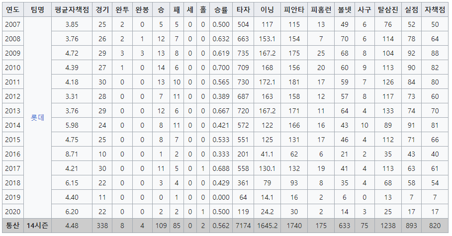 탈삼진 : 1238개 (역대 롯데 자이언츠 1위)
