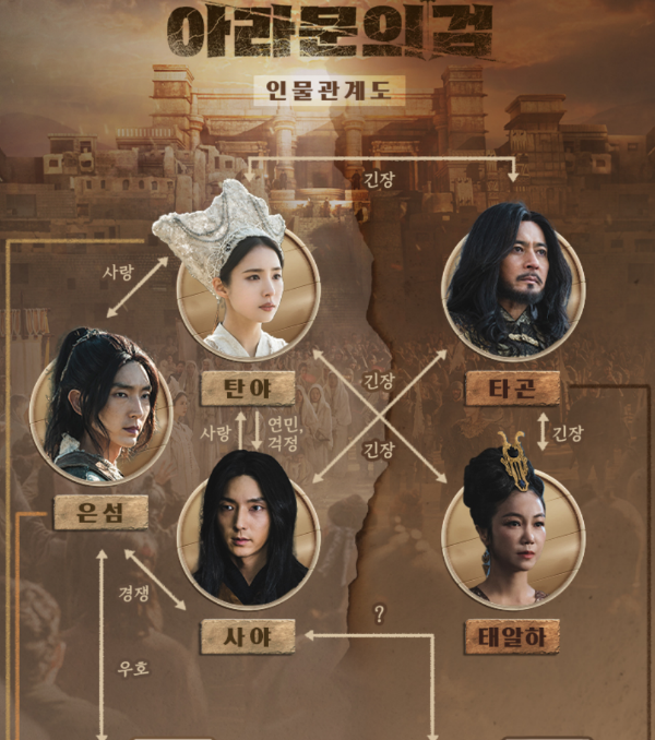 <아라문의검>은 검의 주인이 만들어가는 아스달의 신화, 태고의 땅 아스에서 서로 다른 전설을 만들어 가는 타곤/은섬/탄야/태알하의 운명적인 이야기를 그리는 드라마 입니다.