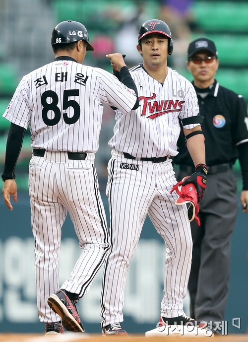 만루홈런으로 홈에 들어 온뒤 믿고 기용해준 김성근 감독에게 모자를 벗고 인사를 깍듯하게 했습니다.