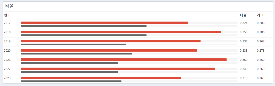 * KBO 리그 평균 타율과 이정후 선수와의 비교를 보면 그가 얼마나 위대한 선수인지를 알수 있습니다.