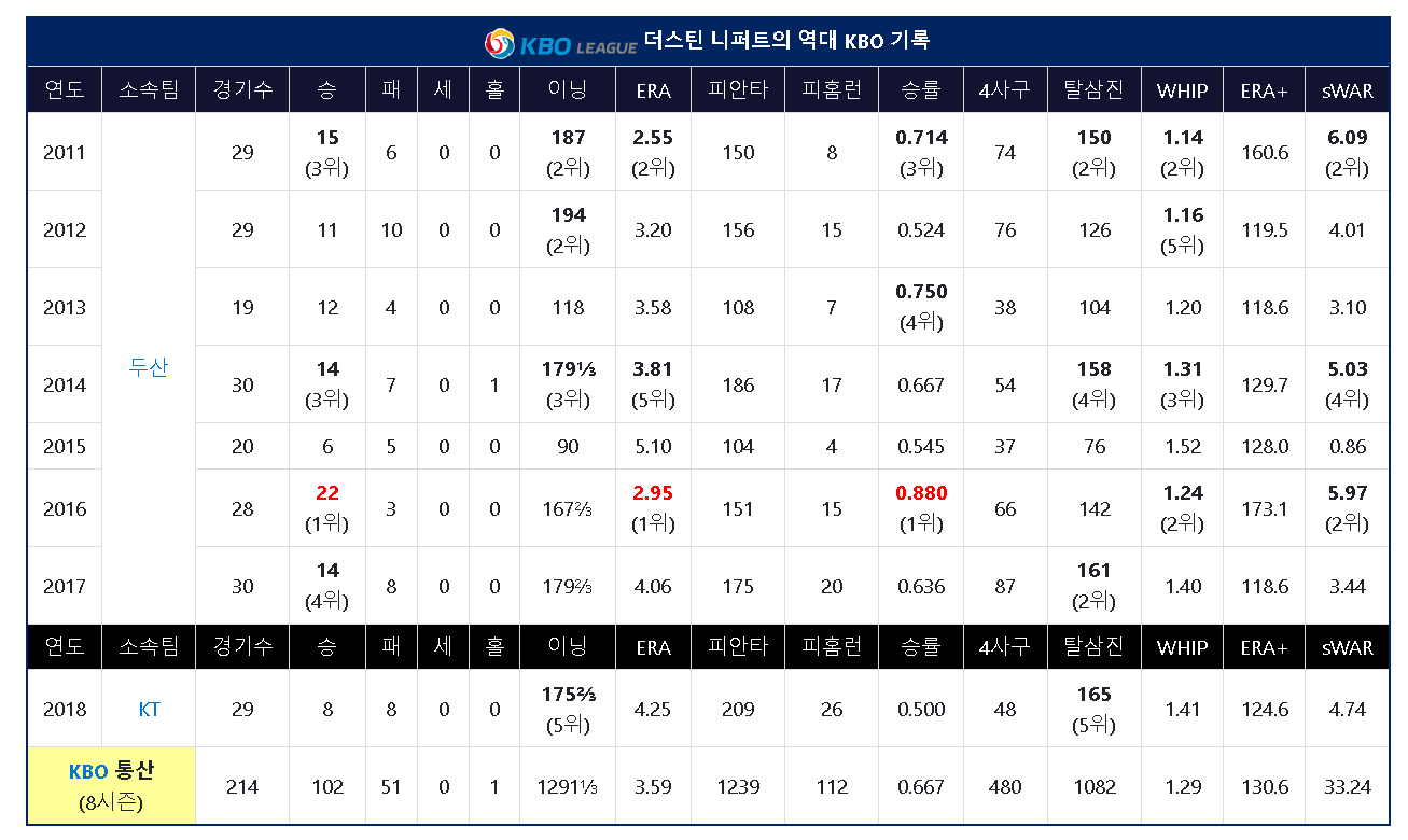 니퍼트가 두산베어스에서 이룬 성적은 대단하다는 말밖에 나오지 않을 성적 입니다.
